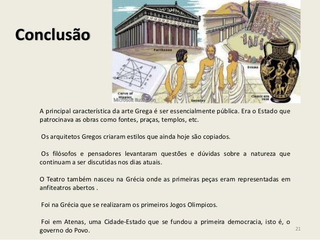 21. 21. ConclusãoA principal característica da arte Grega é ser essencialmente pública. Era o Estado quepatrocinava as obras como fontes, praças, templos, etc.Os arquitetos Gregos criaram estilos que ainda hoje são copiados.Os filósofos e pensadores levantaram questões e dúvidas sobre a natureza quecontinuam a ser discutidas nos dias atuais.O Teatro também nasceu na Grécia onde as primeiras peças eram representadas emanfiteatros abertos .Foi na Grécia que se realizaram os primeiros Jogos Olimpicos.Foi em Atenas, uma Cidade-Estado que se fundou a primeira democracia, isto é, ogoverno do Povo. 21