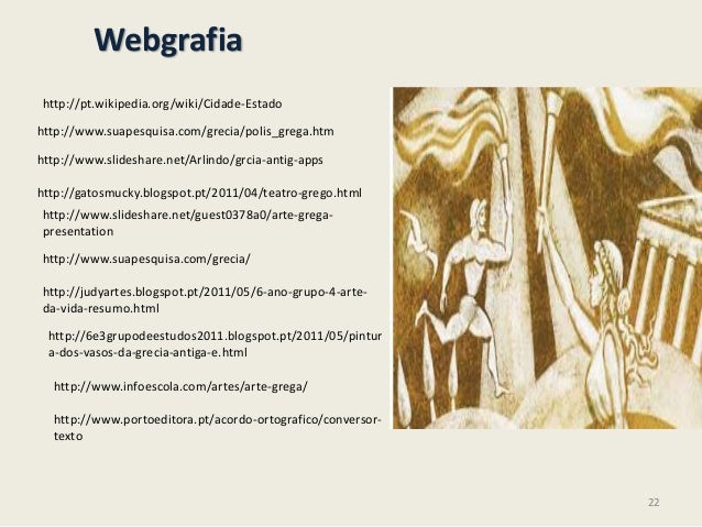22. 22. Webgrafiahttp://www.portoeditora.pt/acordo-ortografico/conversor-textohttp://pt.wikipedia.org/wiki/Cidade-Estadohttp://www.suapesquisa.com/grecia/polis_grega.htmhttp://www.slideshare.net/Arlindo/grcia-antig-appshttp://www.slideshare.net/guest0378a0/arte-grega-presentationhttp://www.suapesquisa.com/grecia/http://gatosmucky.blogspot.pt/2011/04/teatro-grego.htmlhttp://judyartes.blogspot.pt/2011/05/6-ano-grupo-4-arte-da-vida-resumo.htmlhttp://6e3grupodeestudos2011.blogspot.pt/2011/05/pintura-dos-vasos-da-grecia-antiga-e.htmlhttp://www.infoescola.com/artes/arte-grega/22