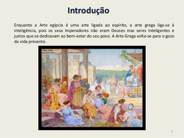 3. 3. IntroduçãoEnquanto a Arte egípcia é uma arte ligada ao espírito, a arte grega liga-se àinteligência, pois os seus Imperadores não eram Deuses mas seres inteligentes ejustos que se dedicavam ao bem-estar do seu povo. A Arte Grega volta-se para o gozoda vida presente.3