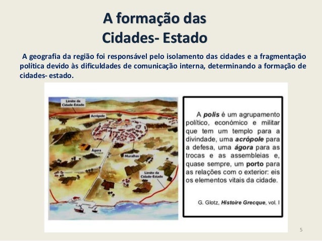 5. 5. A formação dasCidades- EstadoA geografia da região foi responsável pelo isolamento das cidades e a fragmentaçãopolítica devido às dificuldades de comunicação interna, determinando a formação decidades- estado.5