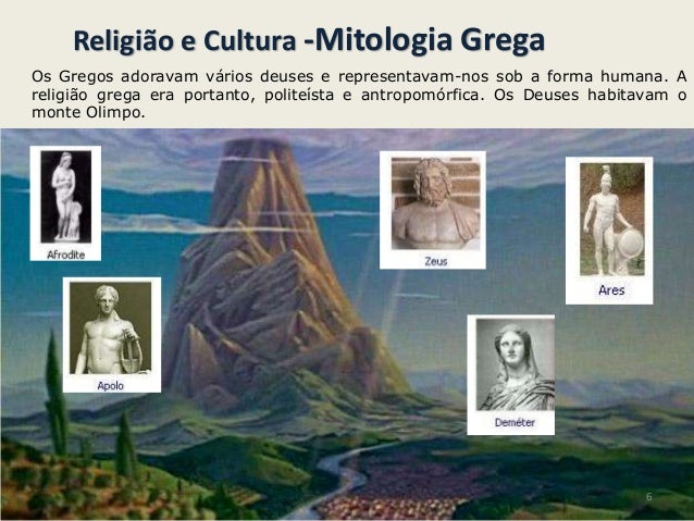 6. 6. Religião e Cultura -Mitologia GregaOs Gregos adoravam vários deuses e representavam-nos sob a forma humana. Areligião grega era portanto, politeísta e antropomórfica. Os Deuses habitavam omonte Olimpo.6
