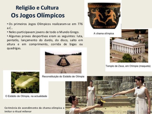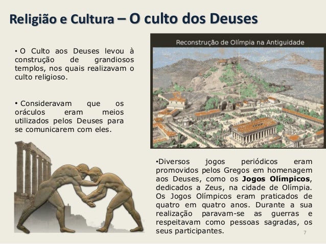 7. 7. Religião e Cultura – O culto dos Deuses• O Culto aos Deuses levou àconstrução de grandiosostemplos, nos quais realizavam oculto religioso.• Consideravam que osoráculos eram meiosutilizados pelos Deuses parase comunicarem com eles.•Diversos jogos periódicos erampromovidos pelos Gregos em homenagemaos Deuses, como os Jogos Olímpicos,dedicados a Zeus, na cidade de Olímpia.Os Jogos Olímpicos eram praticados dequatro em quatro anos. Durante a suarealização paravam-se as guerras erespeitavam como pessoas sagradas, osseus participantes. 7