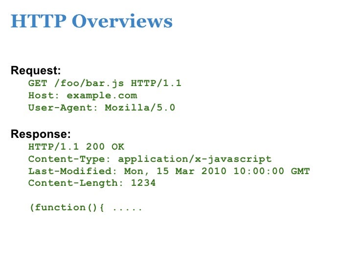 12. 12. HTTP Overviews Request: GET /foo/bar.js HTTP/1.1 Host: example.com User-Agent: Mozilla/5.0 Response: HTTP/1.1 200 OK Content-Type: application/x-javascript Last-Modified: Mon, 15 Mar 2010 10:00:00 GMT Content-Length: 1234 (function(){ .....