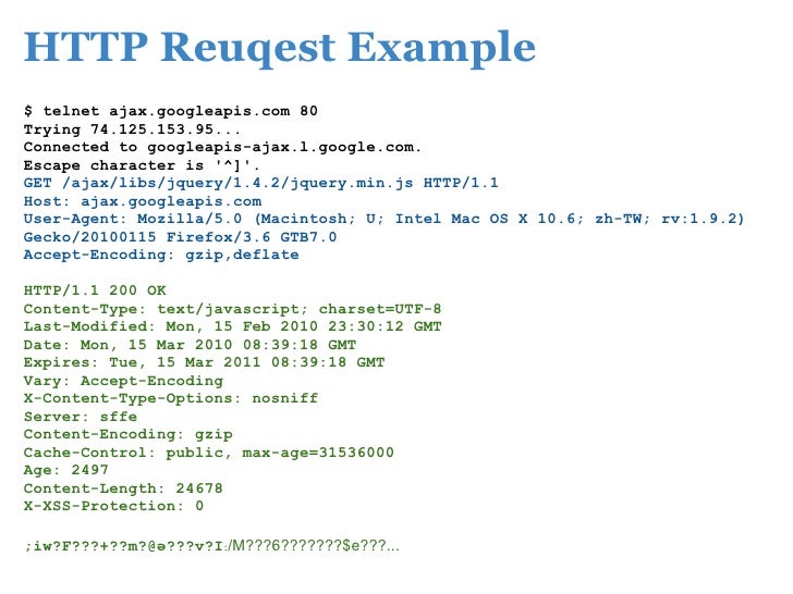 13. 13. HTTP Reuqest Example $ telnet ajax.googleapis.com 80 Trying 74.125.153.95... Connected to googleapis-ajax.l.google.com. Escape character is '^]'. GET /ajax/libs/jquery/1.4.2/jquery.min.js HTTP/1.1 Host: ajax.googleapis.com User-Agent: Mozilla/5.0 (Macintosh; U; Intel Mac OS X 10.6; zh-TW; rv:1.9.2) Gecko/20100115 Firefox/3.6 GTB7.0 Accept-Encoding: gzip,deflate HTTP/1.1 200 OK Content-Type: text/javascript; charset=UTF-8 Last-Modified: Mon, 15 Feb 2010 23:30:12 GMT Date: Mon, 15 Mar 2010 08:39:18 GMT Expires: Tue, 15 Mar 2011 08:39:18 GMT Vary: Accept-Encoding X-Content-Type-Options: nosniff Server: sffe Content-Encoding: gzip Cache-Control: public, max-age=31536000 Age: 2497 Content-Length: 24678 X-XSS-Protection: 0 ;iw?F???+??m?@ə???v?I։/M???6???????$e???...