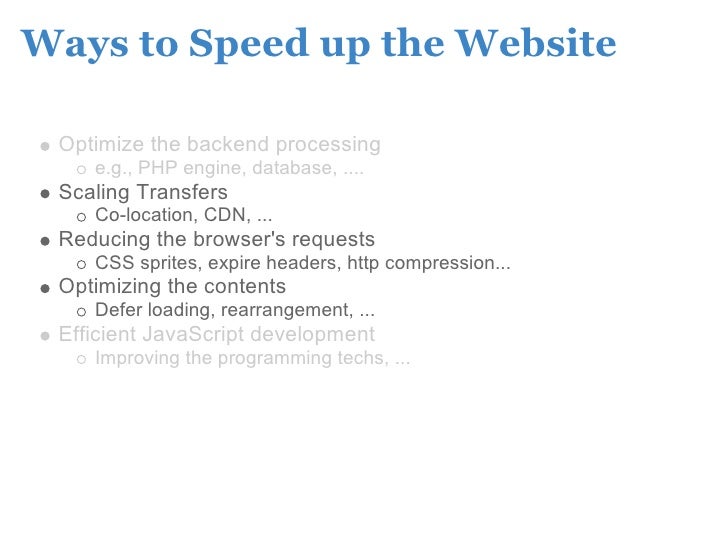 14. 14. Ways to Speed up the Website Optimize the backend processing e.g., PHP engine, database, .... Scaling Transfers Co-location, CDN, ... Reducing the browser's requests CSS sprites, expire headers, http compression... Optimizing the contents Defer loading, rearrangement, ... Efficient JavaScript development Improving the programming techs, ...