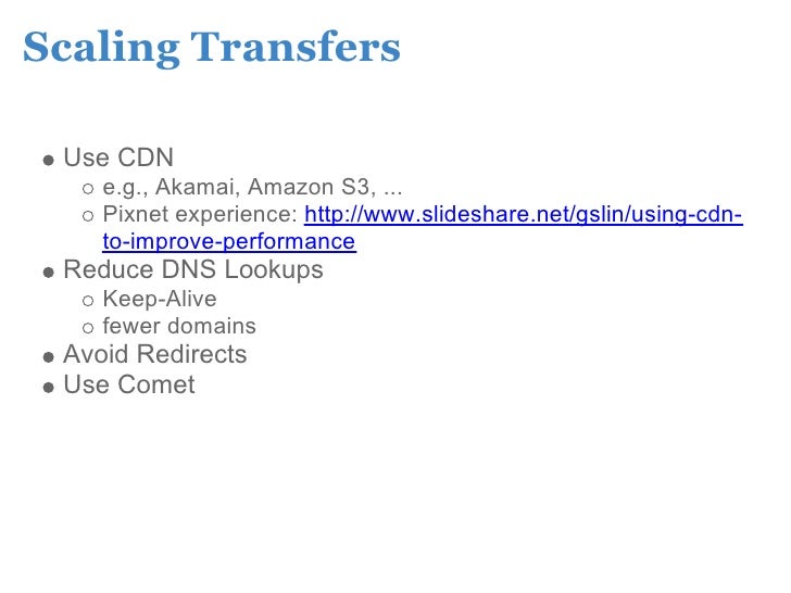 15. 15. Scaling Transfers Use CDN e.g., Akamai, Amazon S3, ... Pixnet experience: http://www.slideshare.net/gslin/using-cdn- to-improve-performance Reduce DNS Lookups Keep-Alive fewer domains Avoid Redirects Use Comet