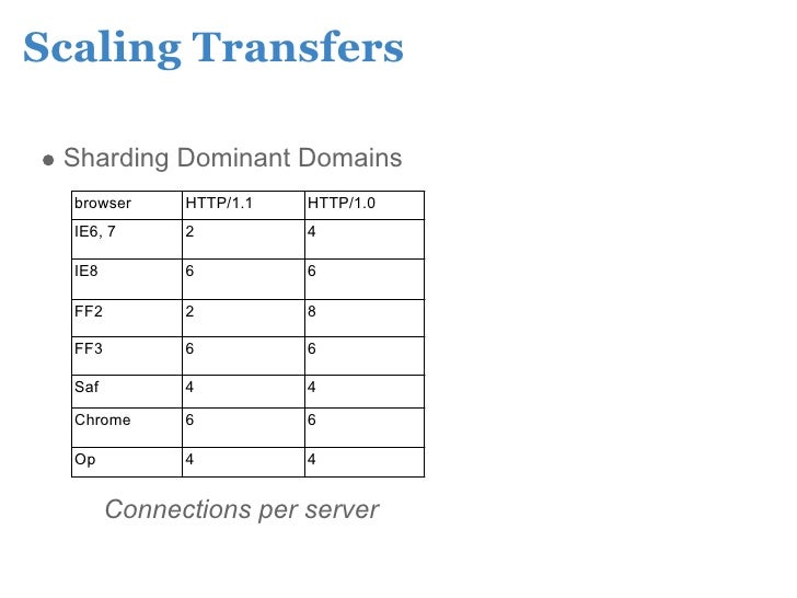 16. 16. Scaling Transfers Sharding Dominant Domains browser HTTP/1.1 HTTP/1.0 IE6, 7 2 4 IE8 6 6 FF2 2 8 FF3 6 6 Saf 4 4 Chrome 6 6 Op 4 4 Connections per server