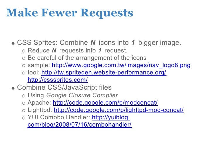 20. 20. Make Fewer Requests CSS Sprites: Combine N icons into 1 bigger image. Reduce N requests info 1 request. Be careful of the arrangement of the icons sample: http://www.google.com.tw/images/nav_logo8.png tool: http://tw.spritegen.website-performance.org/ http://csssprites.com/ Combine CSS/JavaScript files Using Google Closure Compiler Apache: http://code.google.com/p/modconcat/ Lighttpd: http://code.google.com/p/lighttpd-mod-concat/ YUI Comobo Handler: http://yuiblog. com/blog/2008/07/16/combohandler/