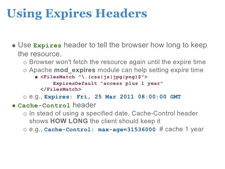 22. 22. Using Expires Headers Use Expires header to tell the browser how long to keep the resource. Browser won't fetch the resource again until the expire time Apache mod_expires module can help setting expire time <FilesMatch ".(css|js|jpg|png)$"> ExpiresDefault "access plus 1 year" </FilesMatch> e.g., Expires: Fri, 25 Mar 2011 08:00:00 GMT Cache-Control header In stead of using a specified date, Cache-Control header shows HOW LONG the client should keep it e.g., Cache-Control: max-age=31536000 # cache 1 year