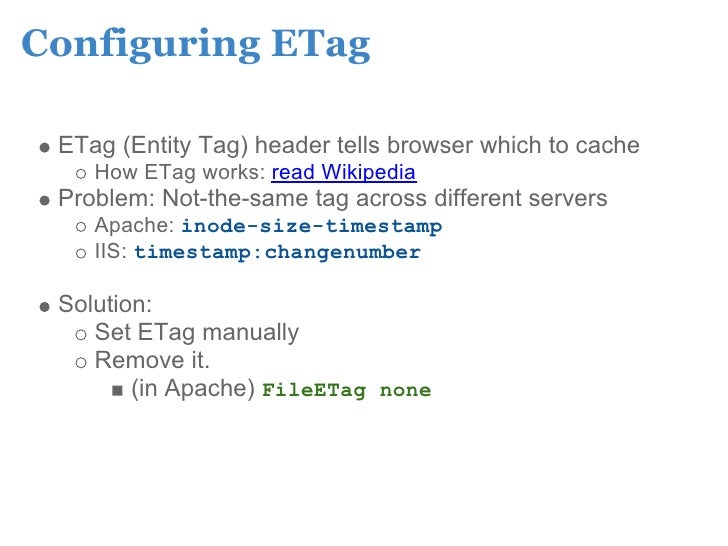 24. 24. Configuring ETag ETag (Entity Tag) header tells browser which to cache How ETag works: read Wikipedia Problem: Not-the-same tag across different servers Apache: inode-size-timestamp IIS: timestamp:changenumber Solution: Set ETag manually Remove it. (in Apache) FileETag none