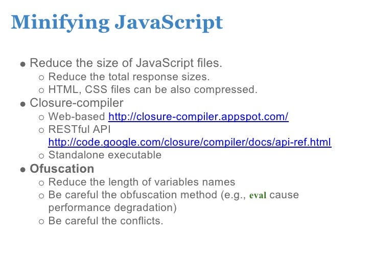 27. 27. Minifying JavaScript Reduce the size of JavaScript files. Reduce the total response sizes. HTML, CSS files can be also compressed. Closure-compiler Web-based http://closure-compiler.appspot.com/ RESTful API http://code.google.com/closure/compiler/docs/api-ref.html Standalone executable Ofuscation Reduce the length of variables names Be careful the obfuscation method (e.g., eval cause performance degradation) Be careful the conflicts.