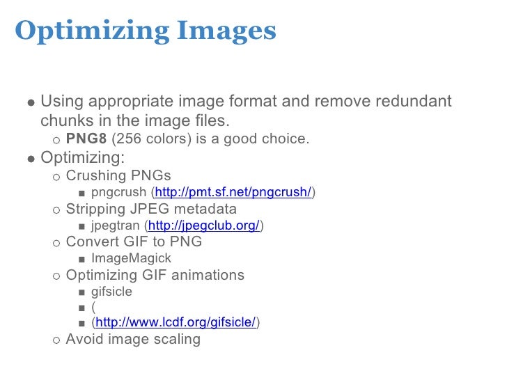 28. 28. Optimizing Images Using appropriate image format and remove redundant chunks in the image files. PNG8 (256 colors) is a good choice. Optimizing: Crushing PNGs pngcrush (http://pmt.sf.net/pngcrush/) Stripping JPEG metadata jpegtran (http://jpegclub.org/) Convert GIF to PNG ImageMagick Optimizing GIF animations gifsicle ( (http://www.lcdf.org/gifsicle/) Avoid image scaling