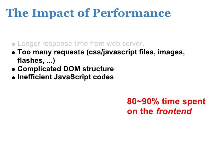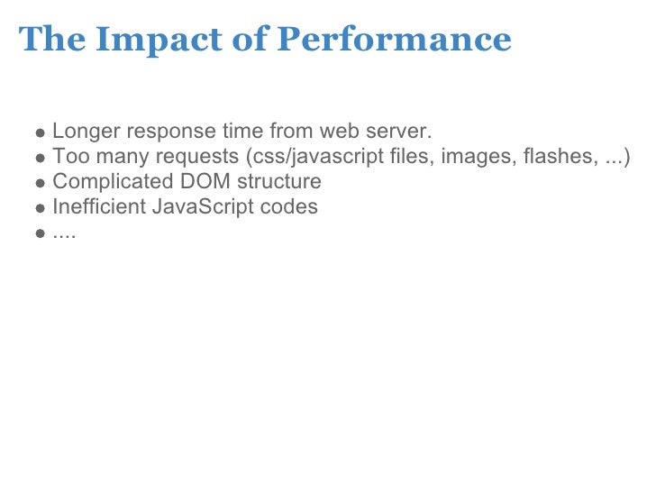 3. 3. The Impact of Performance Longer response time from web server. Too many requests (css/javascript files, images, flashes, ...) Complicated DOM structure Inefficient JavaScript codes ....