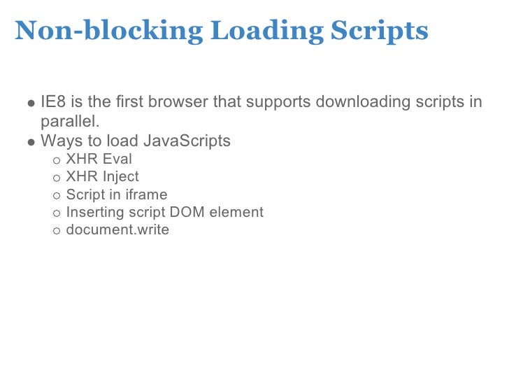 31. 31. Non-blocking Loading Scripts IE8 is the first browser that supports downloading scripts in parallel. Ways to load JavaScripts XHR Eval XHR Inject Script in iframe Inserting script DOM element document.write