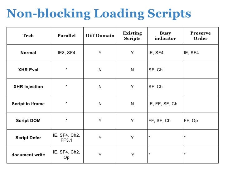 32. 32. Non-blocking Loading Scripts Existing Busy Preserve Tech Parallel Diff Domain Scripts indicator Order Normal IE8, SF4 Y Y IE, SF4 IE, SF4 XHR Eval * N N SF, Ch XHR Injection * N Y SF, Ch Script in iframe * N N IE, FF, SF, Ch Script DOM * Y Y FF, SF, Ch FF, Op IE, SF4, Ch2, Script Defer Y Y * * FF3.1 IE, SF4, Ch2, document.write Y Y * * Op