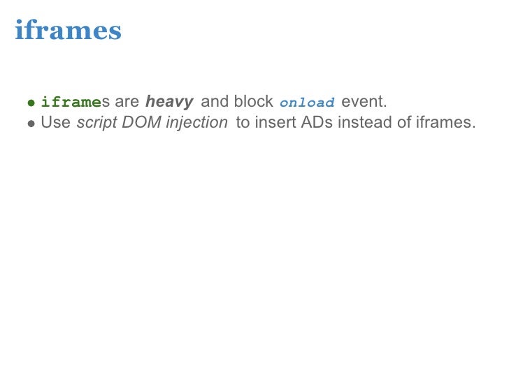 33. 33. iframes iframes are heavy and block onload event. Use script DOM injection to insert ADs instead of iframes.