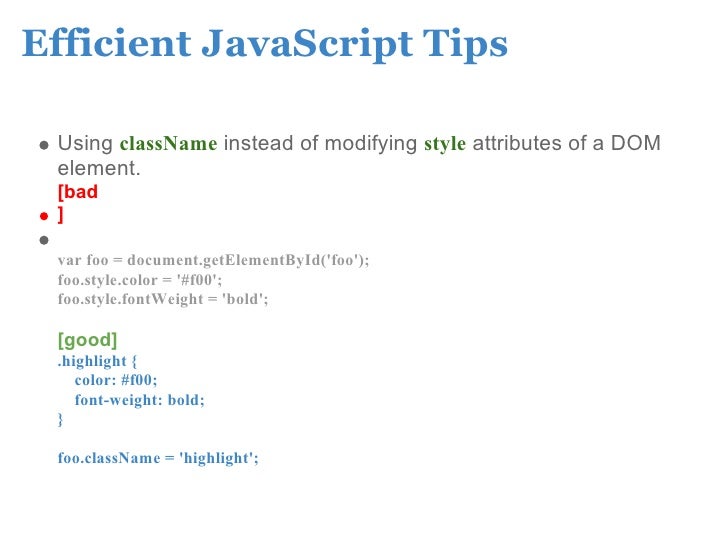 37. 37. Efficient JavaScript Tips Using className instead of modifying style attributes of a DOM element. [bad ] var foo = document.getElementById('foo'); foo.style.color = '#f00'; foo.style.fontWeight = 'bold'; [good] .highlight { color: #f00; font-weight: bold; } foo.className = 'highlight';