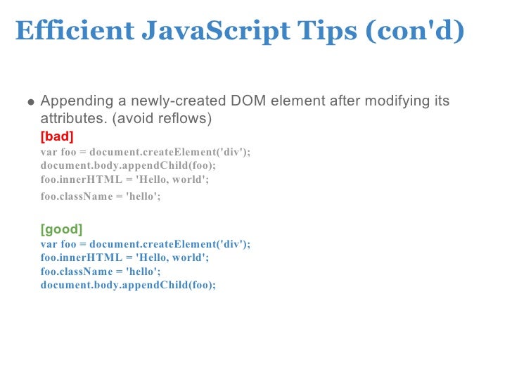 38. 38. Efficient JavaScript Tips (con'd) Appending a newly-created DOM element after modifying its attributes. (avoid reflows) [bad] var foo = document.createElement('div'); document.body.appendChild(foo); foo.innerHTML = 'Hello, world'; foo.className = 'hello'; [good] var foo = document.createElement('div'); foo.innerHTML = 'Hello, world'; foo.className = 'hello'; document.body.appendChild(foo);