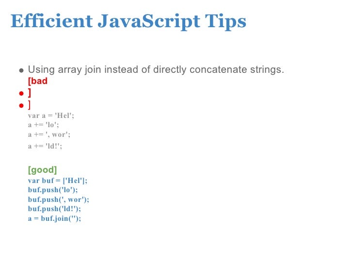 40. 40. Efficient JavaScript Tips Using array join instead of directly concatenate strings. [bad ] ] var a = 'Hel'; a += 'lo'; a += ', wor'; a += 'ld!'; [good] var buf = ['Hel']; buf.push('lo'); buf.push(', wor'); buf.push('ld!'); a = buf.join('');