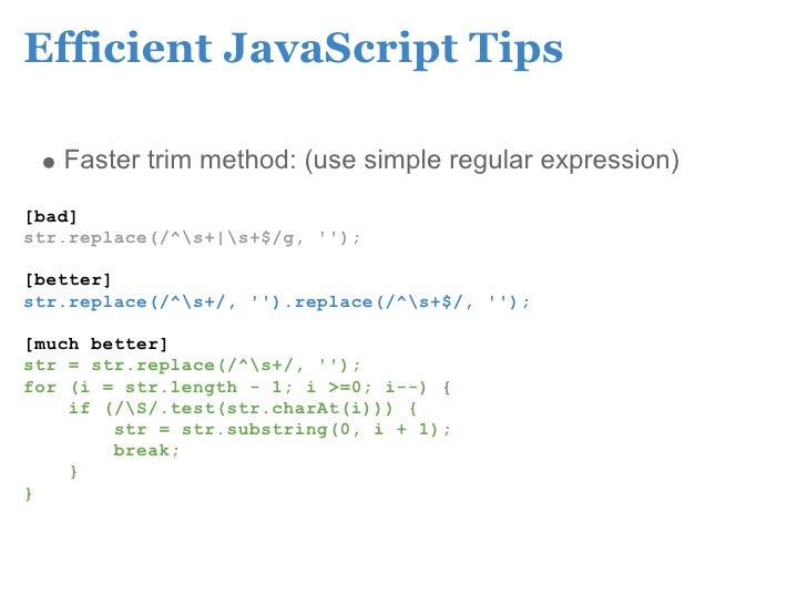 41. 41. Efficient JavaScript Tips Faster trim method: (use simple regular expression) [bad] str.replace(/^s+|s+$/g, ''); [better] str.replace(/^s+/, '').replace(/^s+$/, ''); [much better] str = str.replace(/^s+/, ''); for (i = str.length - 1; i >=0; i--) { if (/S/.test(str.charAt(i))) { str = str.substring(0, i + 1); break; } }