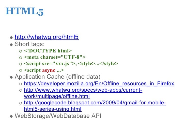 45. 45. HTML5 http://whatwg.org/html5 Short tags: <!DOCTYPE html> <meta charset="UTF-8"> <script src="xxx.js">, <style>...</style> <script async ...> Application Cache (offline data) https://developer.mozilla.org/En/Offline_resources_in_Firefox http://www.whatwg.org/specs/web-apps/current- work/multipage/offline.html http://googlecode.blogspot.com/2009/04/gmail-for-mobile- html5-series-using.html WebStorage/WebDatabase API