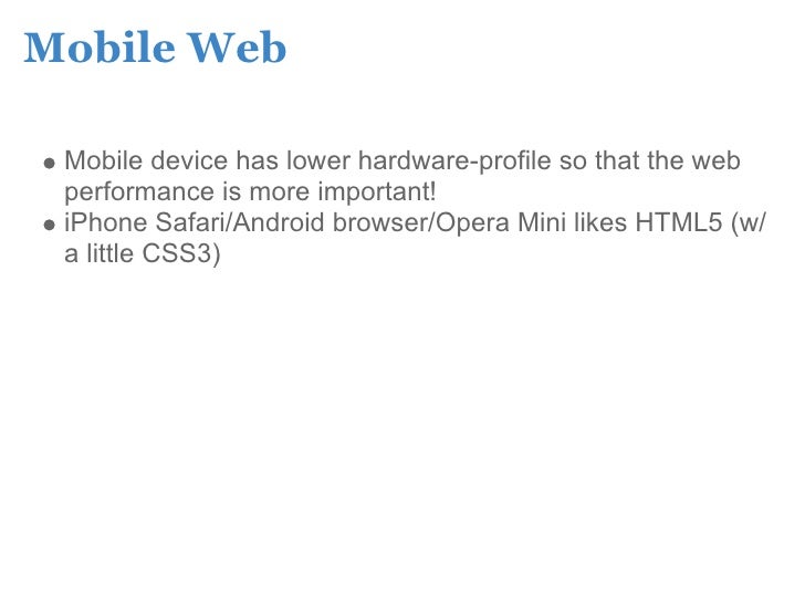 46. 46. Mobile Web Mobile device has lower hardware-profile so that the web performance is more important! iPhone Safari/Android browser/Opera Mini likes HTML5 (w/ a little CSS3)
