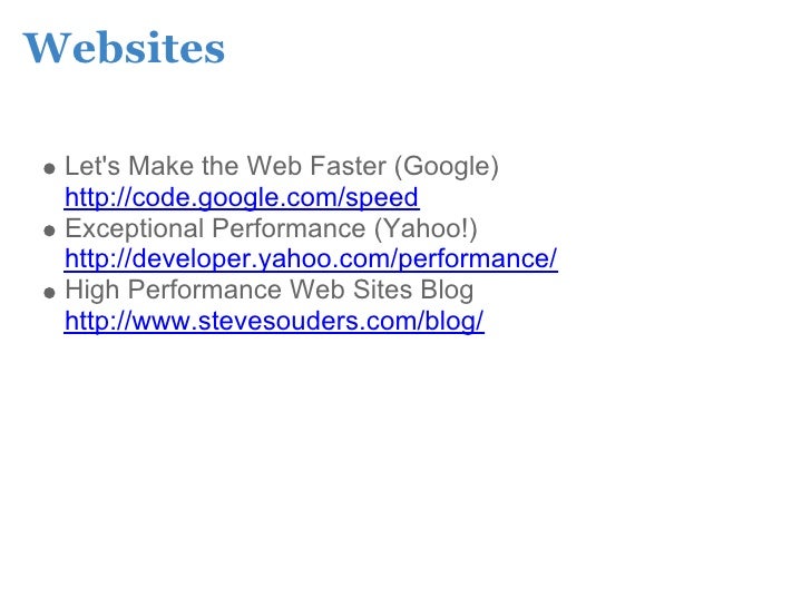 49. 49. Websites Let's Make the Web Faster (Google) http://code.google.com/speed Exceptional Performance (Yahoo!) http://developer.yahoo.com/performance/ High Performance Web Sites Blog http://www.stevesouders.com/blog/