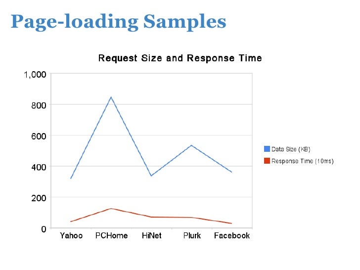 4. 4. The Impact of Performance Longer response time from web server. Too many requests (css/javascript files, images, flashes, ...) Complicated DOM structure Inefficient JavaScript codes 80~90% time spent on the frontend