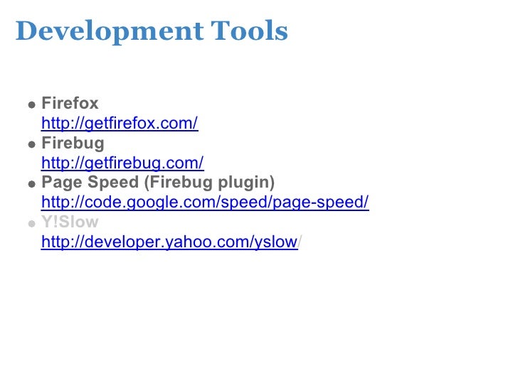6. 6. Development Tools Firefox http://getfirefox.com/ Firebug http://getfirebug.com/ Page Speed (Firebug plugin) http://code.google.com/speed/page-speed/ Y!Slow http://developer.yahoo.com/yslow/