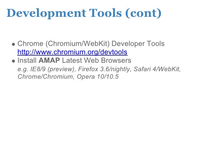 7. 7. Development Tools (cont) Chrome (Chromium/WebKit) Developer Tools http://www.chromium.org/devtools Install AMAP Latest Web Browsers e.g. IE8/9 (preview), Firefox 3.6/nightly, Safari 4/WebKit, Chrome/Chromium, Opera 10/10.5