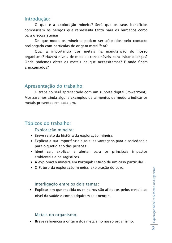 2. 2. Introdução: O que é a exploração mineira? Será que os seus benefícioscompensam os perigos que representa tanto para os humanos comopara o ecossistema? De que modo os mineiros podem ser afectados pelo contactoprolongado com partículas de origem metalífera? Qual a importância dos metais na manutenção do nossoorganismo? Haverá níveis de metais aconselháveis para evitar doenças?Onde podemos obter os metais de que necessitamos? E onde ficamarmazenados?Apresentação do trabalho: O trabalho será apresentado com um suporte digital (PowerPoint).Mostraremos ainda alguns exemplos de alimentos de modo a indicar osmetais presentes em cada um.Tópicos do trabalho: Exploração mineira: • Breve relato da história da exploração mineira. • Explicar a sua importância e as suas vantagens para a sociedade e para o quotidiano das pessoas. • Identificar, explicar e alertar para os principais impactos ambientais e paisagísticos. • A exploração mineira em Portugal: Estudo de um caso particular. • O Futuro da exploração mineira: exploração do ouro. Exploração Mineira & Metais no Organismo Interligação entre os dois temas: • Explicar em que medida os mineiros são afetados pelos metais ao nível da saúde e como adquirem as doenças. Metais no organismo: • Breve referência à origem dos metais no nosso organismo. 2