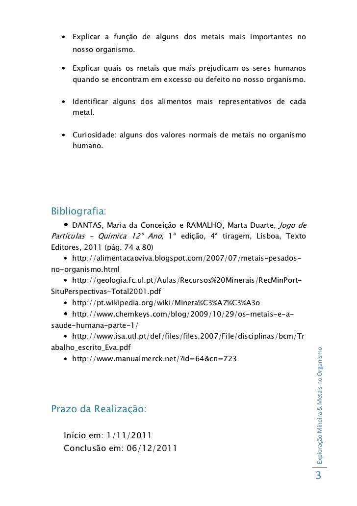 3. 3. • Explicar a função de alguns dos metais mais importantes no nosso organismo. • Explicar quais os metais que mais prejudicam os seres humanos quando se encontram em excesso ou defeito no nosso organismo. • Identificar alguns dos alimentos mais representativos de cada metal. • Curiosidade: alguns dos valores normais de metais no organismo humano.Bibliografia: • DANTAS, Maria da Conceição e RAMALHO, Marta Duarte, Jogo dePartículas – Química 12º Ano, 1ª edição, 4ª tiragem, Lisboa, TextoEditores, 2011 (pág. 74 a 80) • http://alimentacaoviva.blogspot.com/2007/07/metais-pesados-no-organismo.html • http://geologia.fc.ul.pt/Aulas/Recursos%20Minerais/RecMinPort-SituPerspectivas-Total2001.pdf • http://pt.wikipedia.org/wiki/Minera%C3%A7%C3%A3o • http://www.chemkeys.com/blog/2009/10/29/os-metais-e-a-saude-humana-parte-1/ • http://www.isa.utl.pt/def/files/files.2007/File/disciplinas/bcm/Trabalho_escrito_Eva.pdf Exploração Mineira & Metais no Organismo • http://www.manualmerck.net/?id=64&cn=723Prazo da Realização: Início em: 1/11/2011 Conclusão em: 06/12/2011 3