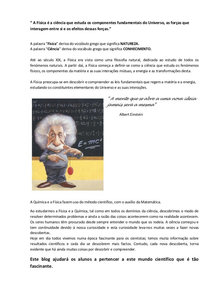 2. 2. “ A Física é a ciência que estuda os componentes fundamentais do Universo, as forças queinteragem entre si e os efeitos dessas forças.”A palavra “Física” deriva do vocábulo grego que significa NATUREZA.A palavra “Ciência” deriva do vocábulo grego que significa CONHECIMENTO.Até ao século XIX, a Física era vista como uma filosofia natural, dedicada ao estudo de todos osfenómenos naturais. A partir daí, a Física começa a definir-se como a ciência que estuda os fenómenosfísicos, os componentes da matéria e as suas interações mútuas, a energia e as transformações desta.A Física preocupa-se em descobrir e compreender as leis fundamentais que regem a matéria e a energia,estudando os constituintes elementares do Universo e as suas interações. “ A mente que se abre a uma nova ideia jamais será a mesma” Albert EinsteinA Química e a Física fazem uso do método científico, com o auxílio da Matemática.Ao estudarmos a Física e a Química, tal como em todos os domínios da ciência, descobrimos o modo deresolver determinados problemas e ainda a razão das coisas acontecerem como na realidade acontecem.Os seres humanos têm procurado desde sempre entender o mundo que os rodeia. A ciência começou etem continuidade devido à nossa curiosidade e esta curiosidade leva-nos muitas vezes a fazer novasdescobertas.Hoje em dia todos vivemos numa época fascinante para os cientistas; temos muita informação sobreresultados científicos e cada dia se descobrem mais factos. Contudo, cada nova descoberta, tornaevidente que há ainda muitas coisas por descobrir e compreender.Este blog ajudará os alunos a pertencer a este mundo científico que é tãofascinante.