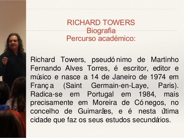 2. 2. RICHARD TOWERS Biografia Percurso académico: Richard Towers, pseudó nimo de Martinho Fernando Alves Torres, é escritor, editor e músico e nasce a 14 de Janeiro de 1974 em Franç a (Saint Germain-en-Laye, Paris). Radica-se em Portugal em 1984, mais precisamente em Moreira de Có negos, no concelho de Guimarães, e é nesta última cidade que faz os seus estudos secundários.