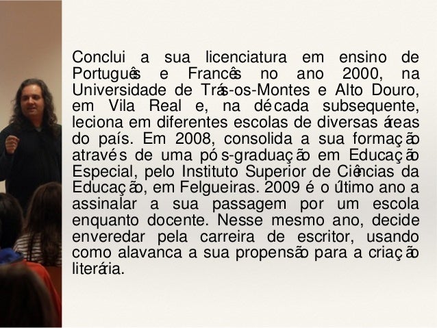 3. 3. Conclui a sua licenciatura em ensino de Português e Francês no ano 2000, na Universidade de Trás-os-Montes e Alto Douro, em Vila Real e, na década subsequente, leciona em diferentes escolas de diversas áreas do país. Em 2008, consolida a sua formaç ão através de uma pó s-graduaç ão em Educaç ão Especial, pelo Instituto Superior de Ciências da Educaç ão, em Felgueiras. 2009 é o último ano a assinalar a sua passagem por um escola enquanto docente. Nesse mesmo ano, decide enveredar pela carreira de escritor, usando como alavanca a sua propensão para a criaç ão literária.