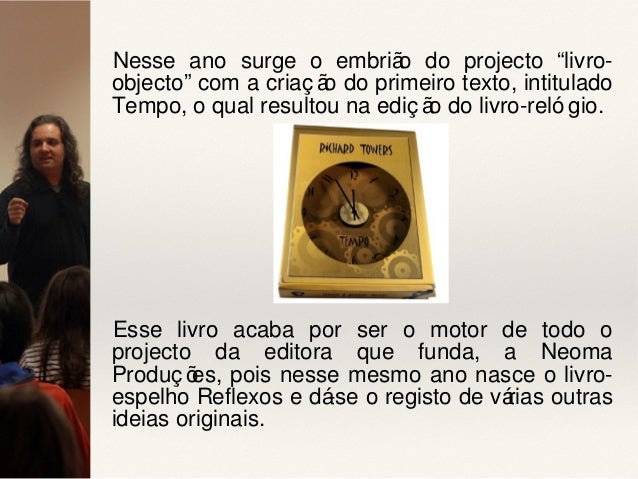 5. 5. Nesse ano surge o embrião do projecto “livro- objecto” com a criaç ão do primeiro texto, intitulado Tempo, o qual resultou na ediç ão do livro-reló gio. Esse livro acaba por ser o motor de todo o projecto da editora que funda, a Neoma Produç ões, pois nesse mesmo ano nasce o livro- espelho Reflexos e dá-se o registo de várias outras ideias originais.