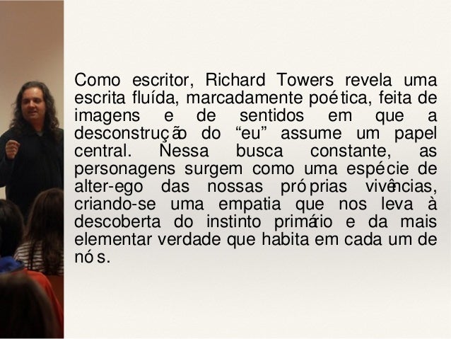6. 6. Como escritor, Richard Towers revela uma escrita fluída, marcadamente poética, feita de imagens e de sentidos em que a desconstruç ão do “eu” assume um papel central. Nessa busca constante, as personagens surgem como uma espécie de alter-ego das nossas pró prias vivências, criando-se uma empatia que nos leva à descoberta do instinto primário e da mais elementar verdade que habita em cada um de nó s.