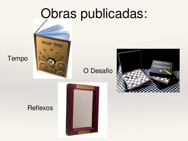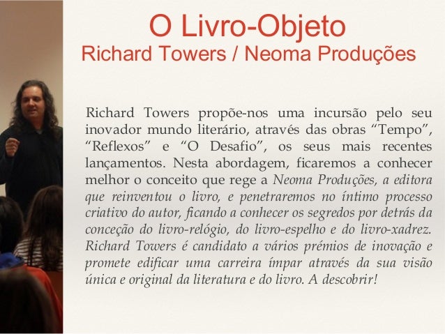 8. 8. O Livro-Objeto Richard Towers / Neoma Produções Richard Towers propõe-nos uma incursão pelo seu inovador mundo literário, através das obras “Tempo”, “Reflexos” e “O Desafio”, os seus mais recentes lançamentos. Nesta abordagem, ficaremos a conhecer melhor o conceito que rege a Neoma Produções, a editora que reinventou o livro, e penetraremos no íntimo processo criativo do autor, ficando a conhecer os segredos por detrás da conceção do livro-relógio, do livro-espelho e do livro-xadrez. Richard Towers é candidato a vários prémios de inovação e promete edificar uma carreira ímpar através da sua visão única e original da literatura e do livro. A descobrir!