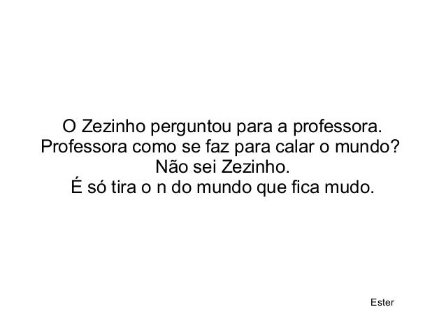 11. 11. O Zezinho perguntou para a professora. Professora como se faz para calar o mundo? Não sei Zezinho. É só tira o n do mundo que fica mudo. Ester