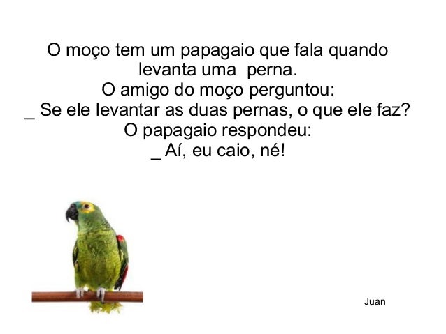18. 18. O moço tem um papagaio que fala quando levanta uma perna. O amigo do moço perguntou: _ Se ele levantar as duas pernas, o que ele faz? O papagaio respondeu: _ Aí, eu caio, né! Juan