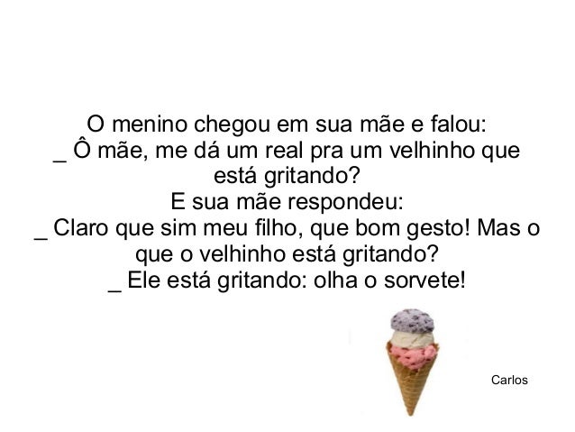 2. 2. O menino chegou em sua mãe e falou: _ Ô mãe, me dá um real pra um velhinho que está gritando? E sua mãe respondeu: _ Claro que sim meu filho, que bom gesto! Mas o que o velhinho está gritando? _ Ele está gritando: olha o sorvete! Carlos