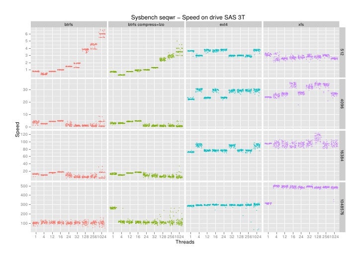 3. 3. Sysbench seqwr − Speed on drive SAS 3T btrfs btrfs compress=lzo ext4 xfs 6 5 4 512 3 2 1 30 4096 20 10Speed 0 120 100 80 16384 60 40 20 500 400 1048576 300 200 100 1 4 12 16 24 32 128 2561024 1 4 12 16 24 32 128 2561024 1 4 12 16 24 32 128 2561024 1 4 12 16 24 32 128 2561024 Threads