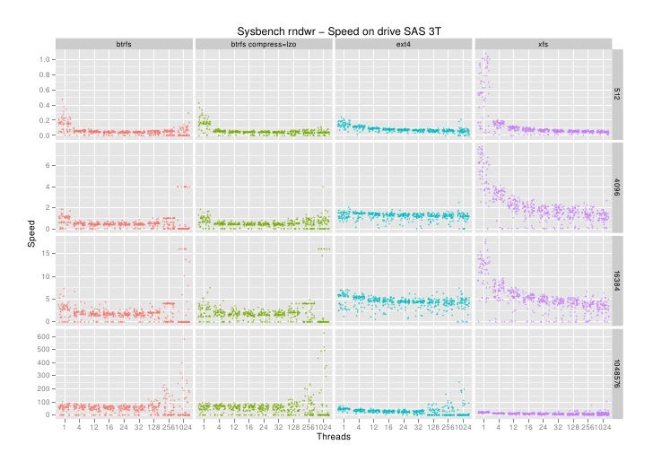 1. 1. Sysbench seqrd − Speed on drive SAS 3T btrfs btrfs compress=lzo ext4 xfs 900 800 512 700 600 500 400 6,000 4096 5,000 4,000Speed 3,000 16,000 14,000 16384 12,000 10,000 8,000 40,000 35,000 30,000 1048576 25,000 20,000 15,000 10,000 1 4 12 16 24 32 128 2561024 1 4 12 16 24 32 128 2561024 1 4 12 16 24 32 128 2561024 1 4 12 16 24 32 128 2561024 Threads