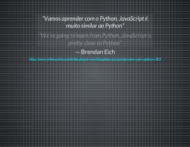 12. 12. “Vamos aprender como Python. JavaScripté muito similar ao Python” “We're going to learn fromPython. JavaScriptis pretty close to Python” — Brendan Eich http://www.infoworld.com/d/developer-world/update-javascript-take-cues-python-323
