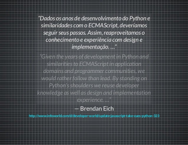 13. 13. “Dados os anos de desenvolvimento do Python e similaridades como ECMAScript, deveríamos seguir seus passos. Assim, reaproveitamos o conhecimento e experiênciacomdesign e implementação. …” “Given the years of developmentin Python and similarities to ECMAScriptin application domains and programmer communities, we would rather follow than lead. By standing on Python's shoulders we reuse developer knowledge as well as design and implementation experience. …” — Brendan Eich http://www.infoworld.com/d/developer-world/update-javascript-take-cues-python-323