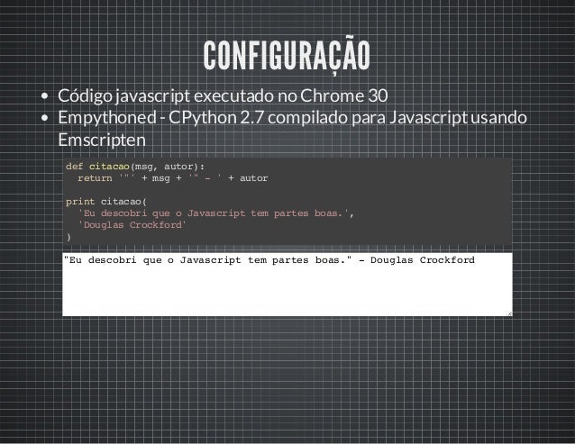 18. 18. CONFIGURAÇÃO Código javascriptexecutado no Chrome 30 Empythoned -CPython 2.7 compilado paraJavascriptusando Emscripten defcitacao(msg,autor): return'"'+msg+'"-'+autor printcitacao( 'EudescobriqueoJavascripttempartesboas.', 'DouglasCrockford' ) "Eu descobri que o Javascript tem partes boas." - Douglas Crockford