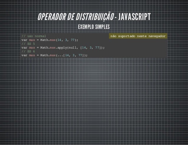 21. 21. OPERADOR DE DISTRIBUIÇÃO - JAVASCRIPT EXEMPLO SIMPLES //usonormal varmax=Math.max(14,3,77); //ES5 varmax=Math.max.apply(null,[14,3,77]); //ES6 varmax=Math.max(...[14,3,77]); nãosuportadonestenavegador