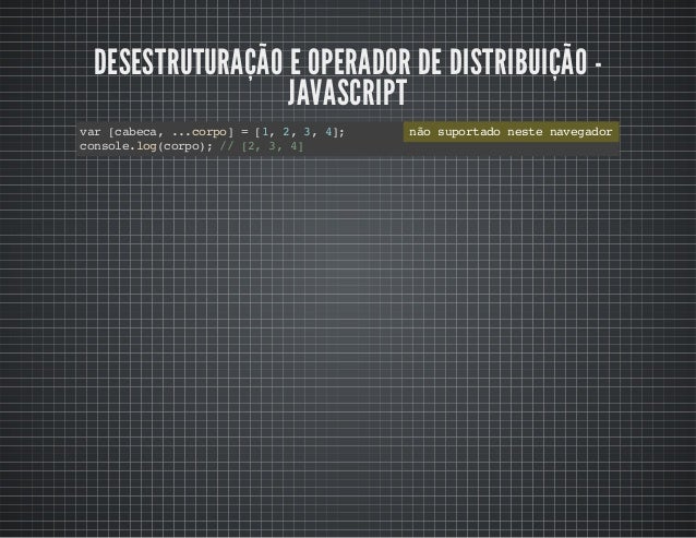 31. 31. DESESTRUTURAÇÃO E OPERADOR DE DISTRIBUIÇÃO - JAVASCRIPT var[cabeca,...corpo]=[1,2,3,4]; console.log(corpo);//[2,3,4] nãosuportadonestenavegador