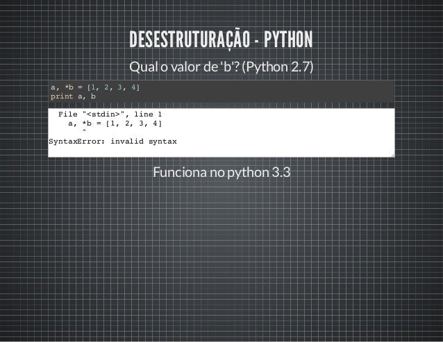 32. 32. DESESTRUTURAÇÃO - PYTHON Qualo valor de 'b'?(Python 2.7) a,*b=[1,2,3,4] printa,b File "<stdin>", line 1 a, *b = [1, 2, 3, 4] ^ SyntaxError: invalid syntax Funcionano python 3.3