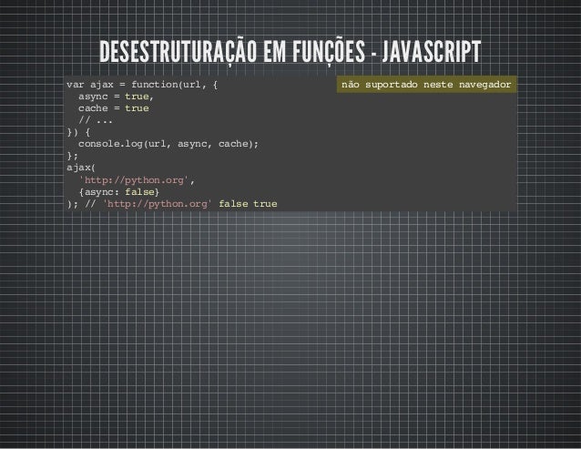 34. 34. DESESTRUTURAÇÃO EM FUNÇÕES - JAVASCRIPT varajax=function(url,{ async=true, cache=true //... }){ console.log(url,async,cache); }; ajax( 'http://python.org', {async:false} );//'http://python.org'falsetrue nãosuportadonestenavegador
